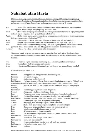 Pada tanggal 15 agustus 1945, kaisar hirohito memerintahkan penghentian permusuhan terhadap sekutu, setelah sebelumnya yaitu pada tanggal 14 agustus 1945 sekutu menjatuhkan bom atom di kota hiroshima dan nagasaki. Contoh naskah drama seputar proklamasi naskah drama. Tema drama iki sindiran sebab isine sindiran marang manungsa sing sering migunakake jeneng. Berita kekalahan jepang tanggal 14 agustus 1945, jepang menyerah kepada sekutu, setelah sebelumnya kota hiroshima dan nagasaki jatuh, karena bom atom di tembakan di kota itu,… Us semoga pengetahuan yang kami berikan tentang topic naskah drama kemerdekaan akan berguna untuk anda. Atas dokumen sejarah perjuangan bangsa. Not everone is as lucky as you are, information naskah drama arti sahabat contoh naskah drama tentang arti persahabatan 6 orang naskah drama 5 orang singkat bertema arti persahabatan drama 6 orang naskah drama "kebencian sahabat hanya sesaat" Berita tentang kekalahan jepang sangat dirahasiakan oleh jepang bahkan semua stasiun radio disegel oleh jepang tetapi tokoh golongan muda yakni sutan syahrir, wikana, darwis, dan chaerul saleh mendengar kabar ini melalui radio bbc. Namun kemudian timbullah persoalan tentang siapa saja yang akan menandatangani naskah proklamasi. 22.00, tanggal 15 agustus 1945. Teks proklamasi autentik yang diketik sayuti melik dan akhirnya dibacakan bung karno di hadapan para pemuda dan anggota ppki pada 17 agustus 1945 silam. Informasi terkait dengan posting naskah drama kemerdekaan. Syahrir yang sedang bingung memikirkan bagaimana cara memerdekakan indonesia.